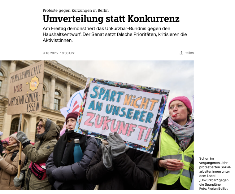 Vergangenen Freitag, den 10. Oktober 2025, protestieren erneut zahlreiche Berliner:innen im #unkürzbar Bündnis gegen die Kürzungen im Berliner Landeshaushalt.