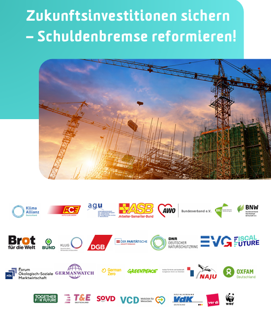 Gemeinsam mit 29 Klima-, Sozial-, Wohlfahrts-, Jugendverbänden, Wirtschaftsverbänden und Gewerkschaften wenden wir uns an die Verhandler*innen von CDU, CSU und SPD. Wir haben gelernt, wer die Finanzierungsfrage nicht nachhaltig löst, kann nicht regieren. Deshalb ist unsere Forderung auch gleichzeitig eine Voraussetzung für ihre Koalition: "Machen Sie die Reform der Schuldenbremse zum zentralen Bestandteil des Koalitionsvertrags. Leiten Sie mit einem finanzpolitischen Kurswechsel für Bund und Länder eine echte Investitionsoffensive ein, die unser Land modernisiert und zukunftsfähig aufstellt."