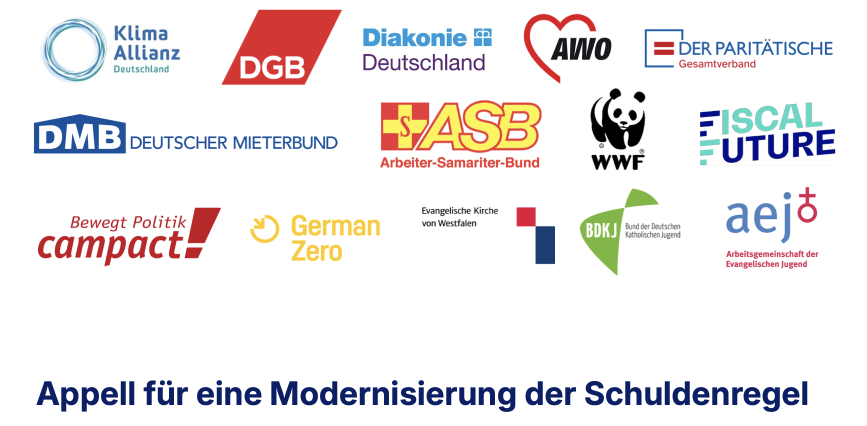Die unterzeichnenden Verbände: Arbeiter-Samariter-Bund Deutschland (ASB), Arbeitsgemeinschaft der Evangelischen Jugend in Deutschland e. V. (aej), AWO-Bundesverband, Bund der Deutschen Katholischen Jugend (BDKJ), Campact, Deutscher Gewerkschaftsbund (DGB), Deutscher Mieterbund (DMB), Diakonie Deutschland, Evangelische Kirche von Westfalen, FiscalFuture, GermanZero, Klima-Allianz Deutschland, Paritätischer Gesamtverband, WWF Deutschland
