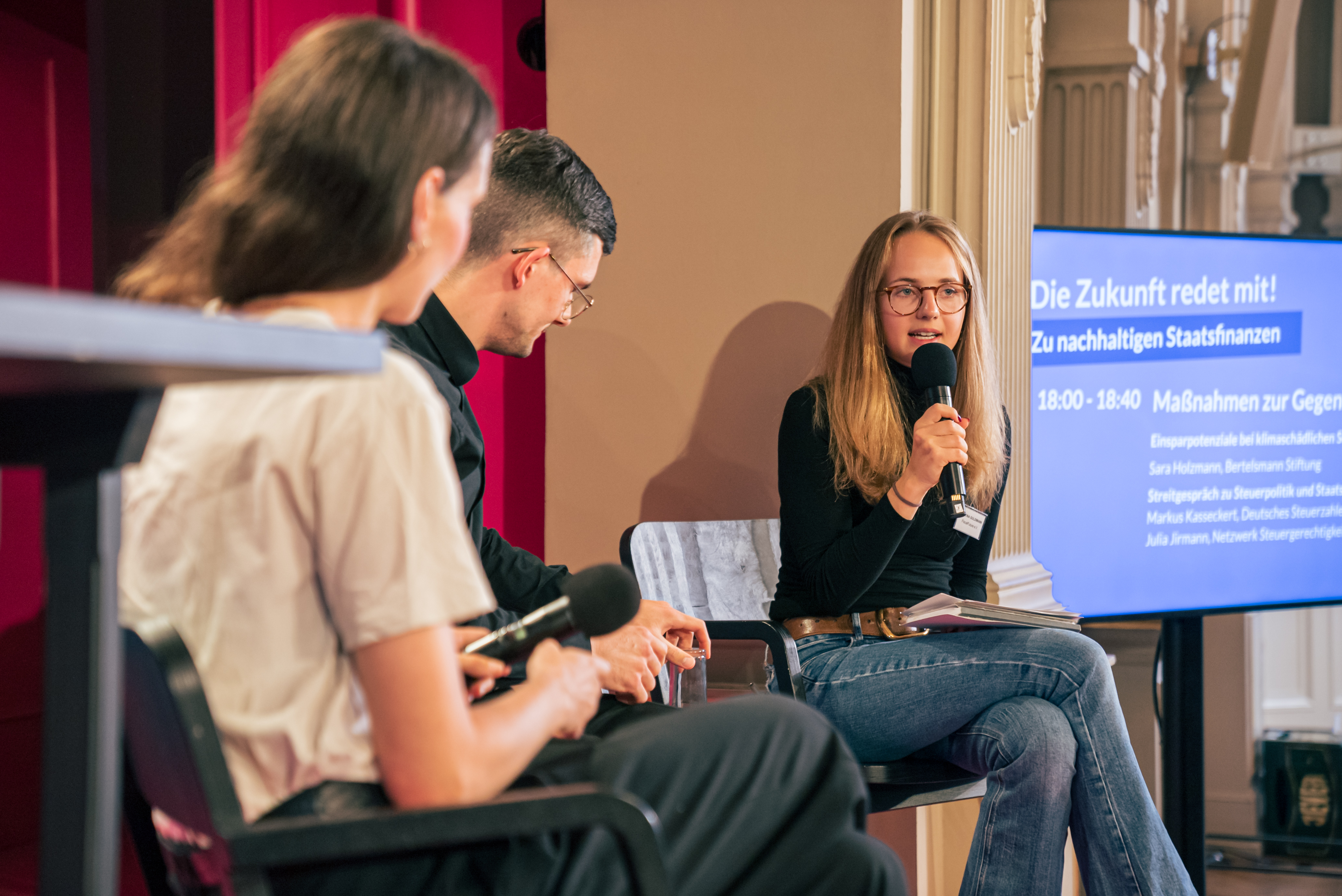 Bei der 3. Veranstaltung der Reihe "Die Zukunft redet mit!" stand das Thema "Nachhaltige Staatsfinanzen" im Zentrum. Wie wir schon bei der Auftaktveranstaltung gelernt haben, ist die Bewertung von Staatfinanzen und Staatsschulden keine rein ökonomische Frage, sondern auch eine Frage von Werturteilen. Das Panel zwischen Katharina Beck (MdB, stv. Vorsitzende des Finanzausschusses, Die Grünen), Helge Braun (MdB, Vorsitzender des Haushaltsausschusses, CDU) und Tim Klüssendorf (MdB, Sprecher der Parlamentarischen Linken, SPD) hat uns wertvolle Einblicke in die politische Diskussion und Abwägungen sowie die Zielkonflikte hinter dem Anspruch an nachhaltige Staatfinanzen gegeben.