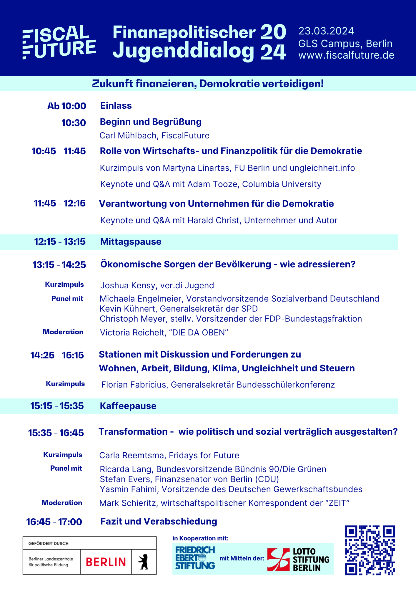 Am Finanzpolitischen Jugenddialog nahmen 2024 mehr als 200 junge Menschen teil. Er wurde durch die Berliner Landeszentrale für politische Bildung gefördert und fand in Kooperation mit der Friedrich-Ebert-Stiftung statt.