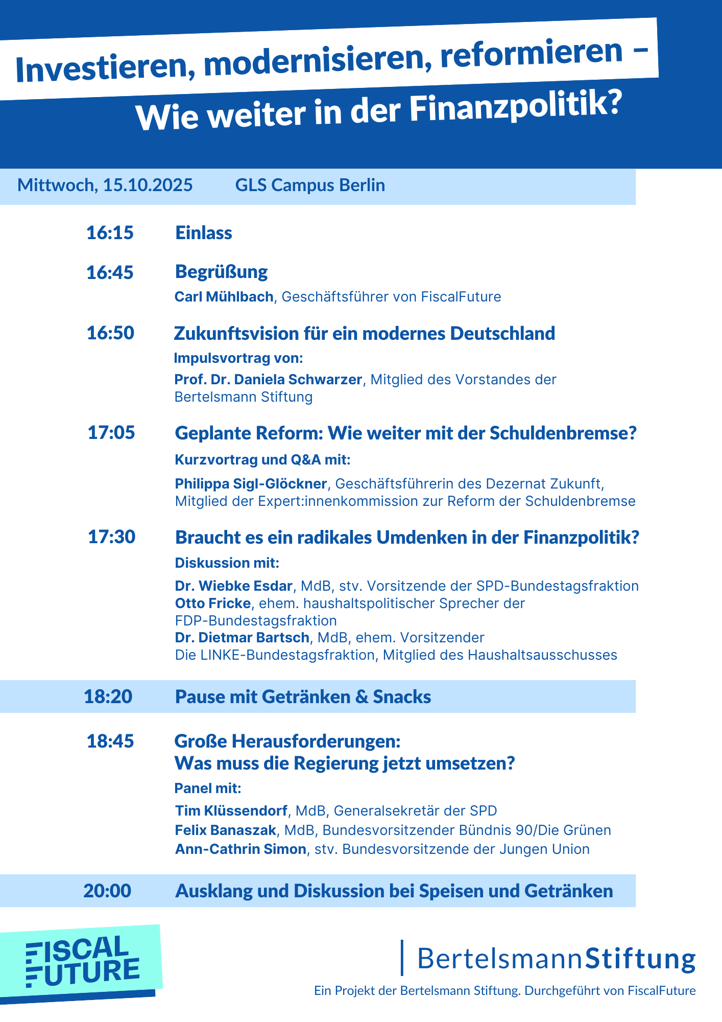 Vor welchen finanzpolitischen Herausforderungen steht die aktuelle Politik? Reicht das Sondervermögen Infrastruktur, um unser Land zu modernisieren? Und wie sollte die Schuldenbremse aus der Sicht junger Menschen langfristig reformiert werden? Darüber möchten wir bei der gemeinsamen Veranstaltung von FiscalFuture und der Bertelsmann Stiftung diskutieren - und bringen mehr als 150 junge Menschen in den direkten Austausch mit Politiker:innen und finanzpolitischen Expert:innen.
