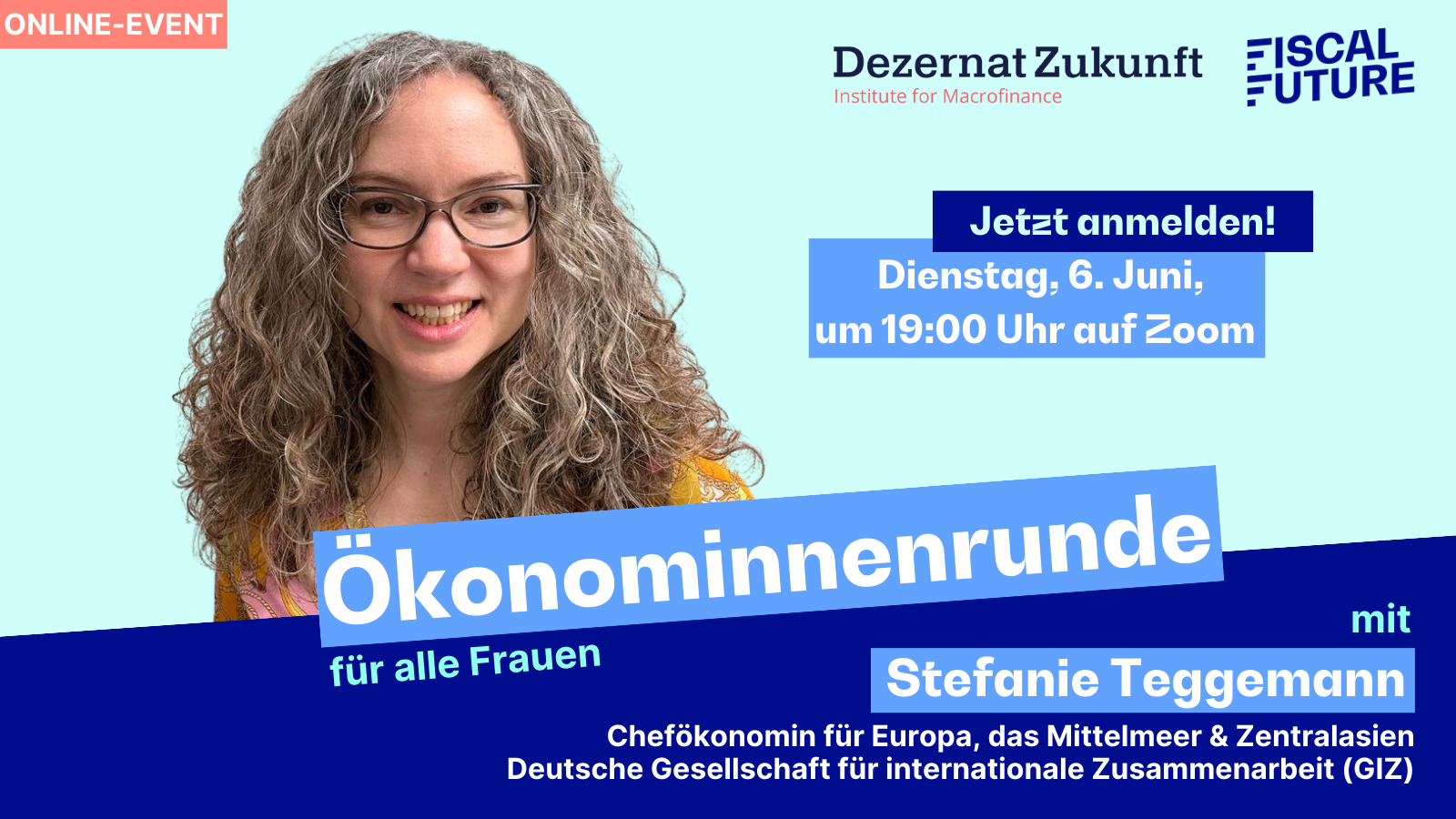 Am 6. Juni findet unsere vierte Ökonominnenrunde in Kooperation mit dem Dezernat Zukunft statt und wir möchten uns mit Vorbildern in der Entwicklungszusammenarbeit auseinandersetzen. Dafür haben wir Stefanie Teggemann eingeladen: Stefanie ist Chief Economist für Europa, das Mittelmeer und Zentralasien bei der Deutschen Gesellschaft für Internationale Zusammenarbeit (giz). Zuvor hat sie über 10 Jahre bei der Weltbank gearbeitet.