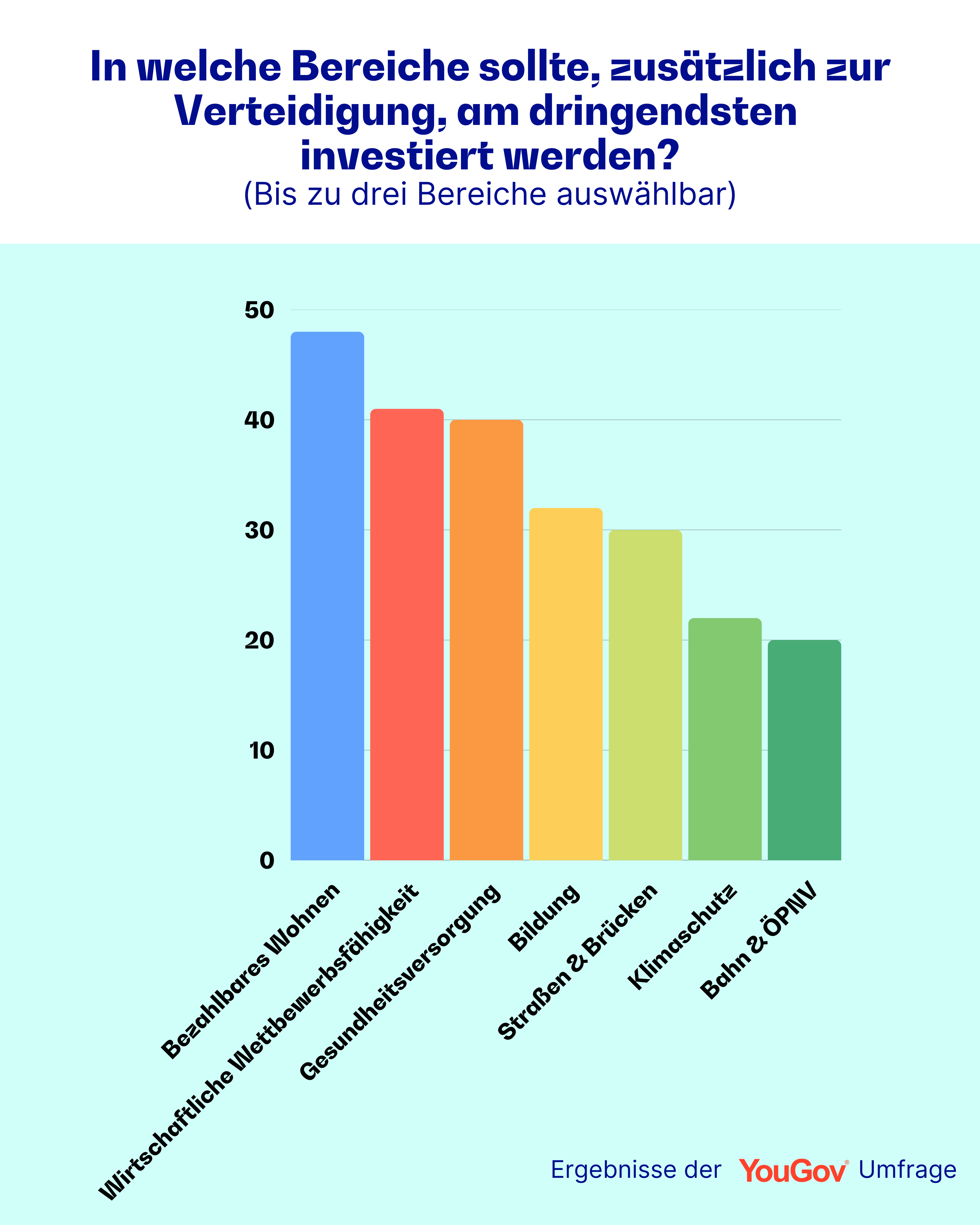 Im Detail ist es für die Befragten wichtig, dass das Sondervermögen nicht nur für klassische Infrastruktur wie Schienen und Straßen, sondern auch für Bildung und Krankenhäuser genutzt werden soll. In der repräsentativen Umfrage wurde abgefragt, in welche Bereiche - zusätzlich zur Verteidigung - am dringendsten investiert werden solle. Die vier am häufigsten gewählten Bereiche sind: Bezahlbares Wohnen (48%), Wirtschaftliche Wettbewerbsfähigkeit (41%), Gesundheitsversorgung (40%) und Bildung (32%).