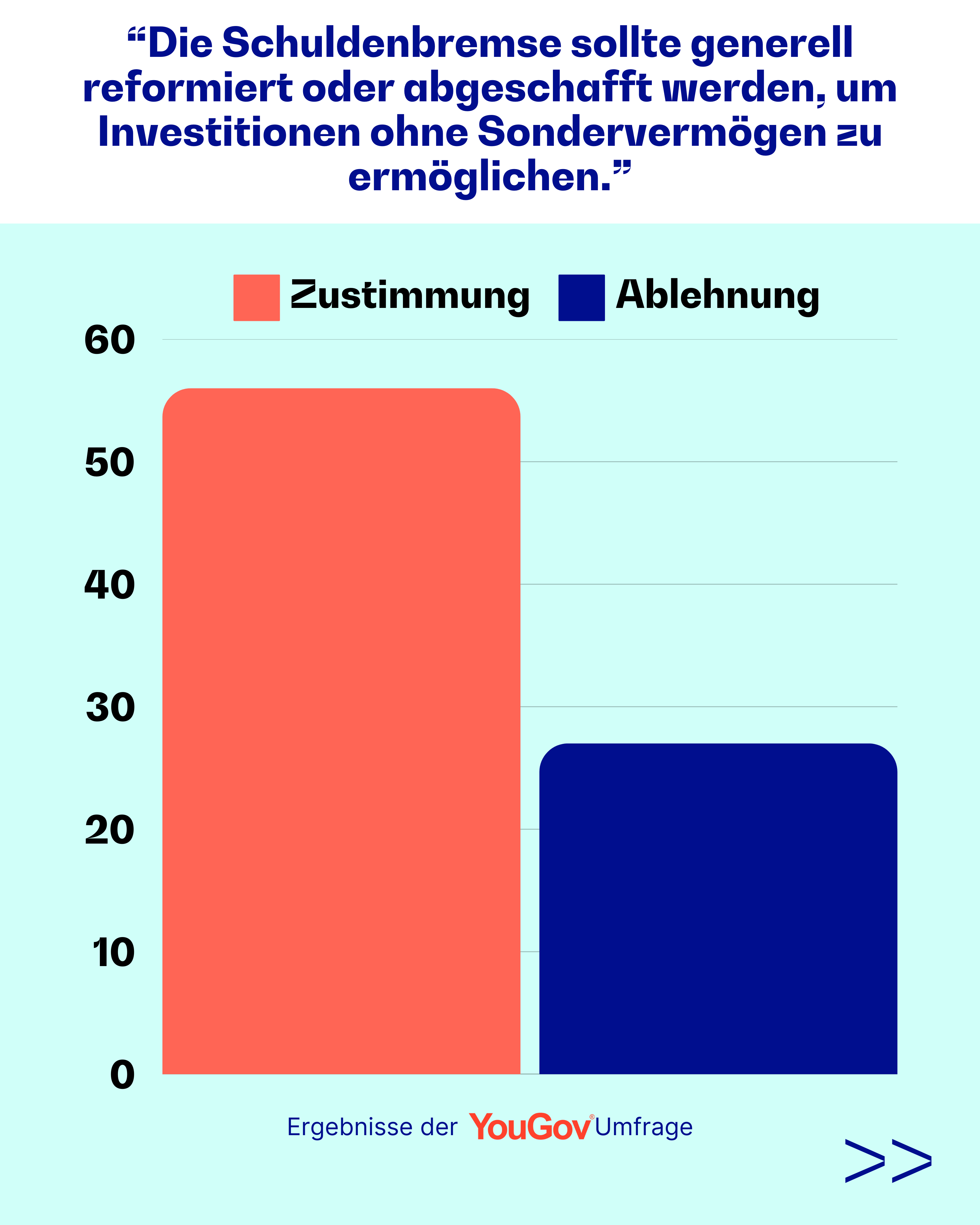 Eine repräsentative Umfrage von YouGov im Auftrag von FiscalFuture hat herausgefunden, dass eine Mehrheit der Bevölkerung sich für eine Reform der Schuldenbremse ausspricht. Dabei sollen neben Verteidigungsausgaben auch breite öffentliche Investitionen in die Infrastruktur, Bildung oder Gesundheit ermöglicht werden.