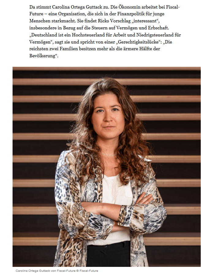 Der Unternehmer Josef Rick ist Multimillionär und schlägt eine Steuerreform vor, um das Steuersystem gerechter zu gestalten. Expert:innen wie Stefan Bach vom DIW und Carolina Ortega Guttack, Ökonomin von FiscalFuture, bewerten seinen Vorschlag in der Frankfurter Rundschau. Carolina Ortega Guttack weist insbesondere auf die aktuellen Gerechtigkeitslücken bei Vermögen und Erbschaften hin: „Deutschland ist ein Hochsteuerland für Arbeit und Niedrigsteuerland für Vermögen“, sagt sie und spricht von einer „Gerechtigkeitslücke“: „Die reichsten zwei Familien besitzen mehr als die ärmere Hälfte der Bevölkerung“.