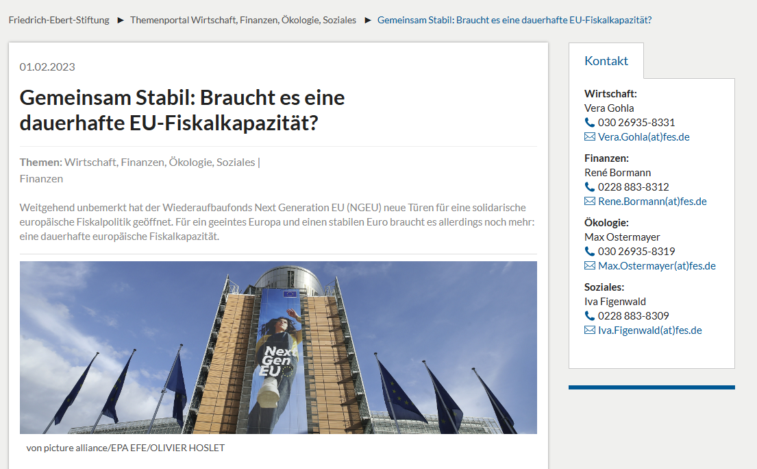 Im Anschluss an den "Tag der Progressiven Wirtschaftspolitik 2022" der Friedrich-Ebert-Stiftung haben Carl Mühlbach und Jannis Schenider von FiscalFuture einen Beitrag zu der Frage verfasst: "Braucht es eine dauerhafte EU-Fiskalkapazität?"