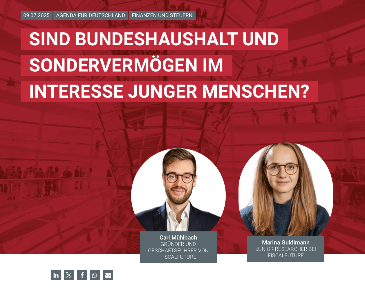 Passend zur Generaldebatte im Deutschen Bundestag ordnen Carl Mühlbach und Marina Guldimann ihrem Beitrag für den Blog “Politische Ökonomie” des SPD-Wirtschaftsforums den Haushaltsentwurf und das Fiskalpaket aus der Perspektive junger Menschen ein.