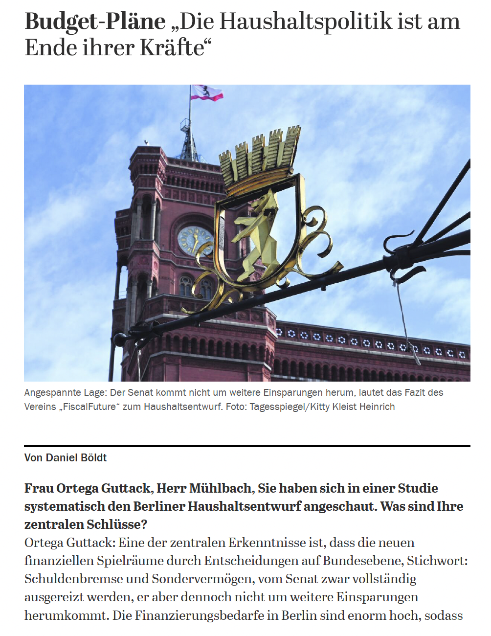 Carolina Ortega Guttack und Carl Mühlbach haben im Tagesspiegel ein Interview zu der neuen Kurz-Studie von FiscalFuture gegeben, in der es um den Berliner Haushalt geht. Im Interview erklären sie, warum die finanziellen Spielräume des Senats ausgeschöpft sind, welche Rolle der Bund spielt und welche Wege es aus der angespannten Lage geben könnte.