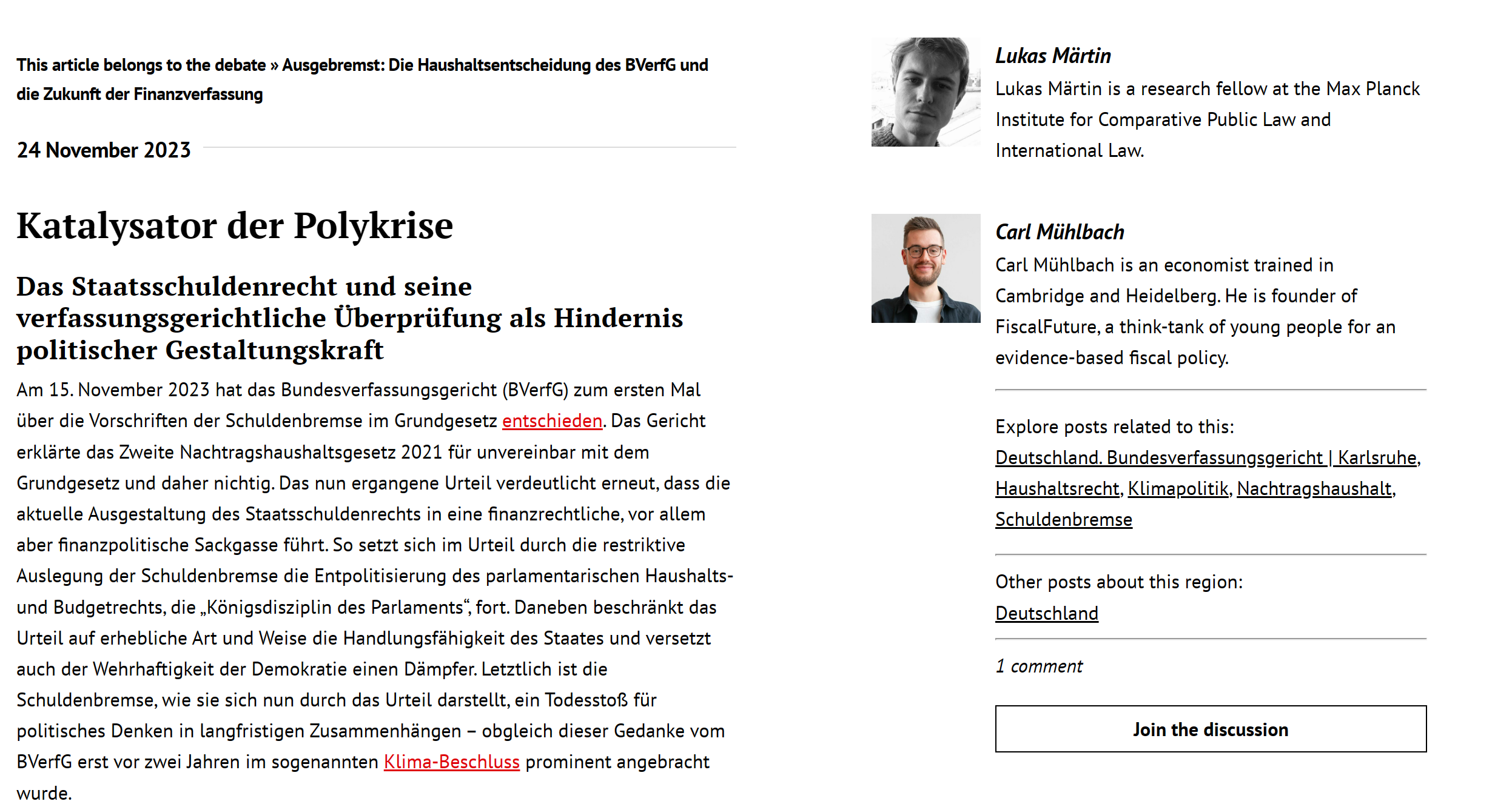 Verfassungsblog zum BVerfG-Urteil zur Schuldenbremse